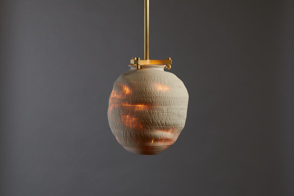 Each piece in the Desert Series is a unique work of art, made of porcelain using a unique fabrication technique developed with Paone’s paternal aunt, the ceramicist Anne Paone. Two new additions in this series, the Desert Table Lamp and Large Desert Pendant in the Negative Finish, offer the same visual and textural elements in an alluring shade of black with blackened brass hardware. The Negative Finish, conceived with new collaborator ceramicist Jeff Nimeh, takes the original series and inverts the aesthetic using metallic oxides and carbonates.