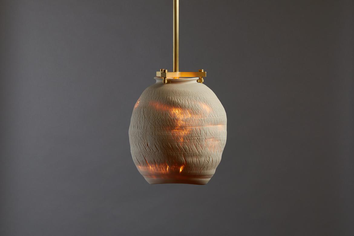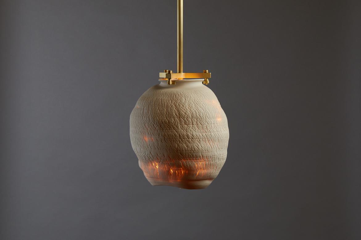 Inspired by the beauty of a dried-out desert lake bed, each piece is a handmade one-of-a-kind object that produces a mysterious quality when internally lit, embracing the flaws and accidents inherent in the craft and process of making: the series exemplifies the wabi-sabi ethos of acceptance of transience and imperfection.