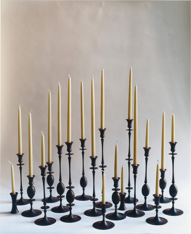 The candlesticks are based on three basic shapes: the egg, an attenuated rod, and a trumpet form. Permutations of these convex and concave shapes have yielded 5 different pieces. By combining and varying these, Muehling has created 17 different candlesticks that can be used individually, in symmetrical pairs, or in groupings of 3 or more. They are available in burnished brass, oxidized bronze, polished or pumiced sterling silver plate, or pumiced 24k gold plate. The darkened bronze accentuates the silhouette, emphasizing a neoclassical origin, while polished or pumiced surfaces enhance the play of light on the forms.